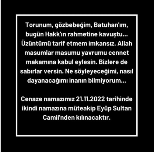 DHA’da yer alan habere göre Albayrak açıklamasında, “Torunum, gözbebeğim, Batuhan’ım, bugün Hakk’ın rahmetine kavuştu. Üzüntümü tarif etmem imkansız. Allah masumlar masumu yavrumu cennet mekanına kabul eylesin. Bizlere de sabırlar versin. Ne söyleyeceğimi, nasıl dayanacağımı inanın bilmiyorum. Cenaze namazımız 21.11.2022 tarihinde ikindi namazına müteakip Eyüp Sultan Camii’nde kılınacaktır” ifadelerine yer verdi.