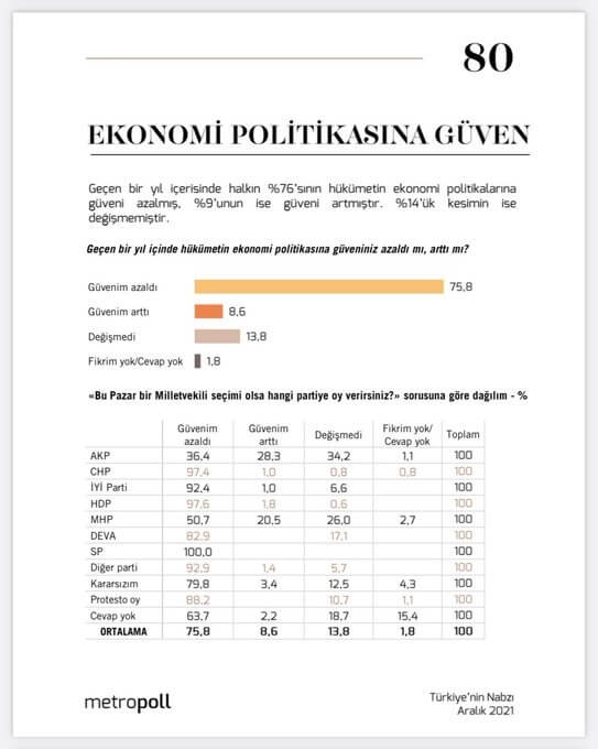 Kararsızların da yüzde 79,8’i ekonomi politikasına güvenmediğini ifade ederken, protesto oy kullanacağını söyleyenlerin yüzde 88,2’si hükümetin politikalarına güven duymadığını belirtti.