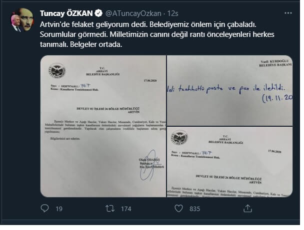 Milletimizin canını değil rantı önceleyenleri herkes tanımalı. Belgeler ortada” notuyla, Artvin’de yaşanan sel felaketinden aylar önce Arhavi Belediyesi’nin önlem alınması için Devlet Su İşleri 26. Bölge Müdürlüğü’ne gönderdiği resmi yazıları paylaştı.