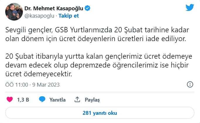 “Sevgili gençler, GSB Yurtlarımızda 20 Şubat tarihine kadar olan dönem için ücret ödeyenlerin ücretleri iade ediliyor. 20 Şubat itibarıyla yurtta kalan gençlerimiz ücret ödemeye devam edecek olup depremzede öğrencilerimiz ise hiçbir ücret ödemeyecektir.”