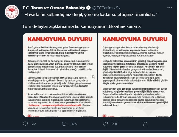 Diğer yandan yine yangında kullandığımız uçakların çok büyük olduğunu, bu yüzden vadilere giremediğini iddia edenler var. Yangın söndürmede dünyada değişik boyutlarda uçaklar kullanılmaktadır. Orman yangınlarıyla mücadelede kullanılan uçaklar hangi boyut ve kapasitede olursa olsun bu amaç için üretildiğinden bu tür yorumlara da itibar edilmemesi gerektiğini belirtmek isteriz.”