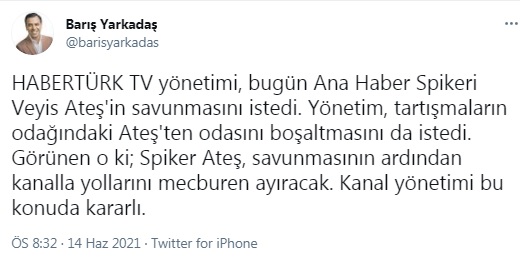 “HABERTÜRK TV yönetimi, bugün Ana Haber Spikeri Veyis Ateş’in savunmasını istedi.