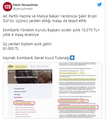 - AK Partili Hazine ve Maliye Bakan Yardımcısı Şakir Ercan Gül’ün, üçüncü yerden aldığı maaşı da tespit ettik. Eximbank Yönetim Kurulu Başkanı ücreti: aylık 10.370 TL + yıllık 4 maaş ikramiye. Üç yerden toplam aylık geliri: 81.005 TL Kaynak: Eximbank Genel Kurul Tutanağı