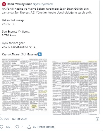 Yavuzyılmaz, daha önce Hazine ve Maliye Bakan Yardımcısı Şakir Ercan Gül’ün aynı zamanda Sun Express Yönetim Kurulu Üyesi olduğunu ve çift maaş aldığını ifşa etmişti. Buna göre Gül’ün, bakan yardımcılığından 27.917 TL, Sun Express’ten 3.750 Avro olmak üzere, aylık gelirinin 67 bin 179 TL olduğunu ortaya çıkarmıştı.