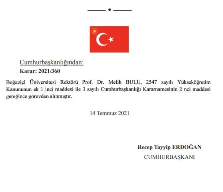 Boğaziçi Üniversitesi Rektörü Prof. Dr. Melih Bulu, 2547 sayılı Yükseköğretim Kanunu ve 3 sayılı Cumhurbaşkanlığı Kararnamesi gereğince görevinden alındı. Bulu’nun yerine herhangi bir atama yapılmadı.