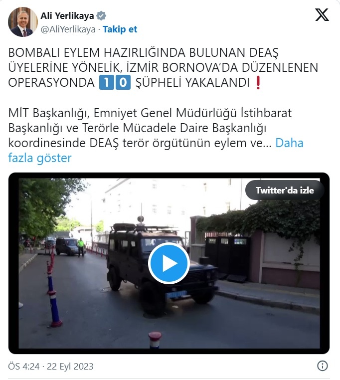 “MİT Başkanlığı, Emniyet Genel Müdürlüğü İstihbarat Başkanlığı ve Terörle Mücadele Daire Başkanlığı koordinesinde DEAŞ terör örgütünün eylem ve faaliyetlerini engellenmesine yönelik #İzmir İl Emniyet Müdürlüğümüzce yapılan çalışmalar kapsamında;