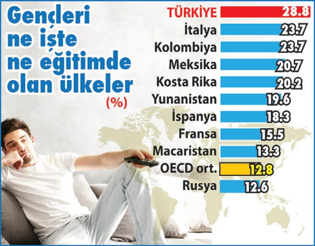 Türkiye, OECD ülkeleri içinde gençleri en çok ‘boşta gezen’ ülke. Türkiye’de ne eğitimde ne istihdamda olan gençlerin oranı yüzde 28.8. DİSK-AR raporuna göre bu oranla dünya birincisiyiz. Türkiye’yi İtalya, Kolombiya, Meksika ve Kosta Rika izliyor. OECD ortalamasında ne işte ne eğitimde olan gençlerin oranı yüzde 12.8 seviyesinde. Lüksemburg, İzlanda, Hollanda, İsviçre, İsveç, Norveç, Almanya, Slovenya ve Çekya OECD ülkeleri arasında genç işsizliğinin en düşük olduğu ülkeler.