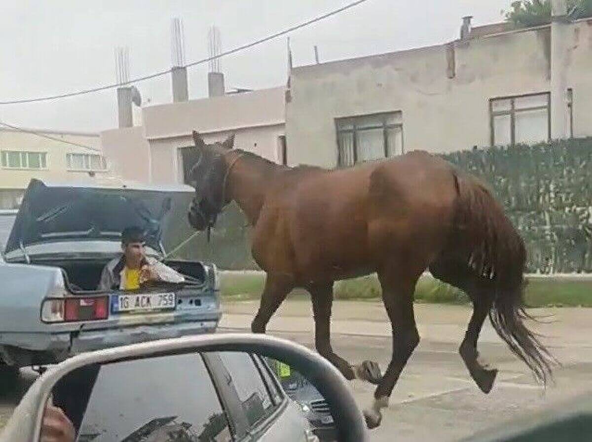 Bursa’da bir atın, aracın bagajında oturan biri tarafından çekilerek saatlerce koşturulması vatandaşların tepkisine neden oldu.