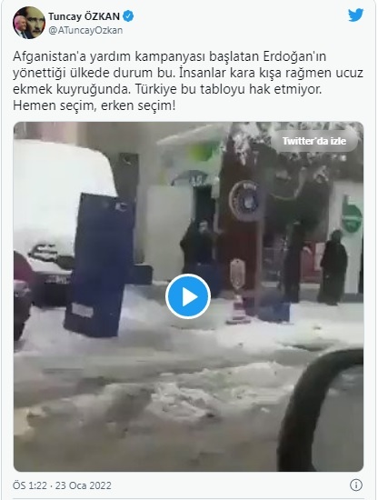“Afganistan’a yardım kampanyası başlatan Erdoğan’ın yönettiği ülkede durum bu. İnsanlar kara kışa rağmen ucuz ekmek kuyruğunda. Türkiye, bu tabloyu hak etmiyor. Hemen seçim, erken seçim!”