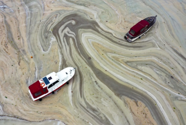 Çevre ve Şehircilik Bakanlığı ekipleri, sahilde biriken müsilajları bariyerlerle bir yerde topladıktan sonra hortumlarla depolama tanklarına doldurdu.