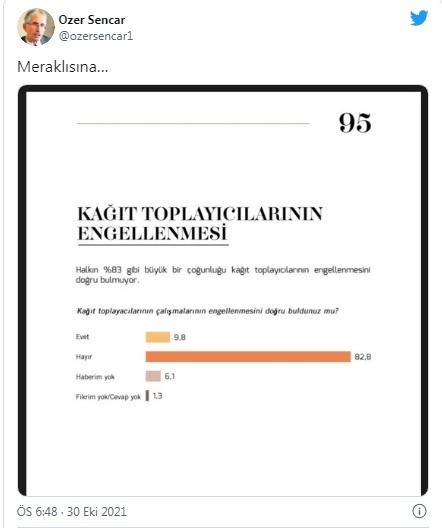 Sencar’ın ‘meraklısına’ notuyla yaptığı Twitter paylaşımına göre, ankette vatandaşa “Kağıt toplayıcılarının engellenmesini doğru buldunuz mu?” sorusu yöneltildi. Ankete katılanların yüzde 9,8’i ‘evet’, yüzde 82,8 ‘hayır’, yüzde 6.1’i ‘bilgim yok’, 1.3’ü ise ‘fikrim yok’ yanıtı verdi.