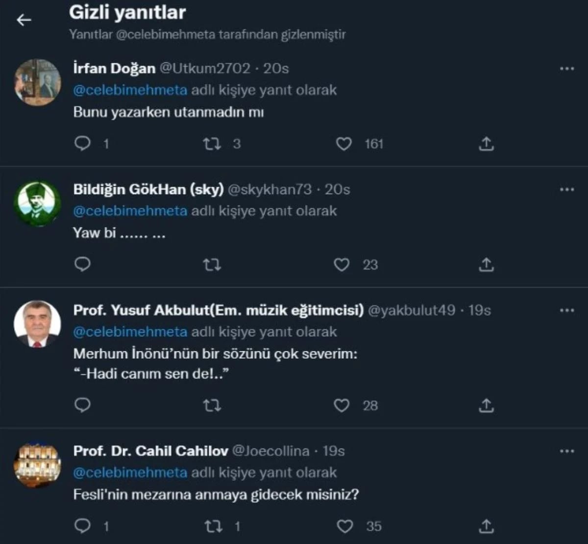 Çelebi’nin paylaşımına çok sayıda tepki geldi. Çelebi gelen tepkiler nedeniyle paylaşımına gelen yorumların bazılarını gizlemek zorunda kaldı.
