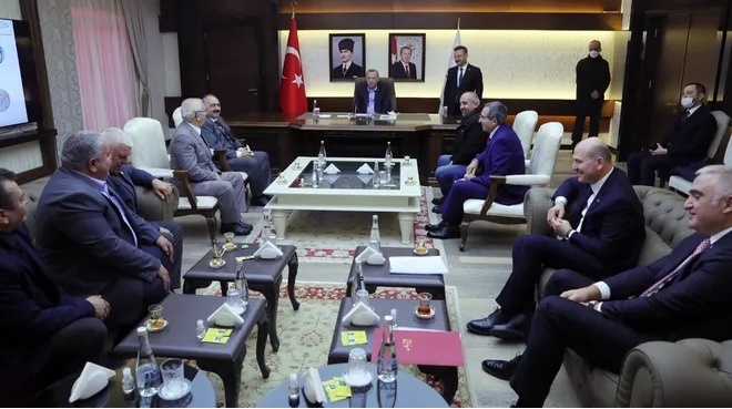 Cumhurbaşkanı Recep Tayyip Erdoğan dün miting ve toplu açılış yapmak için bulunduğu Aydın’da cemevi başkanları ve muhtarlarla valilikte bir araya geldi. Toplantıya Eğrek Alevi Bektaşi Kültür ve Cemevi Derneği Başkanı Mehmet Akyüz, Bozdoğan Alamut Mahallesi Cemevi Kültür ve Dayanışma Derneği Başkanı Hasan Özçörtük, Söke Güzeltepe Mahallesi Kültürünü Yaşatma Derneği Başkanı Özgül Avcı, Alevi Kültür Dernekleri Söke Şubesi Başkanı Şevki Kaya ile Çine Dutluoluk Mahallesi Muhtarı Sadık Yıldız, Bozdoğan Alamut Mahalle Muhtarı Hasbi Şen ve Efeler Yılmazköy Mahalle Muhtarı Özkan Tosun’dan oluşan heyet katıldı.