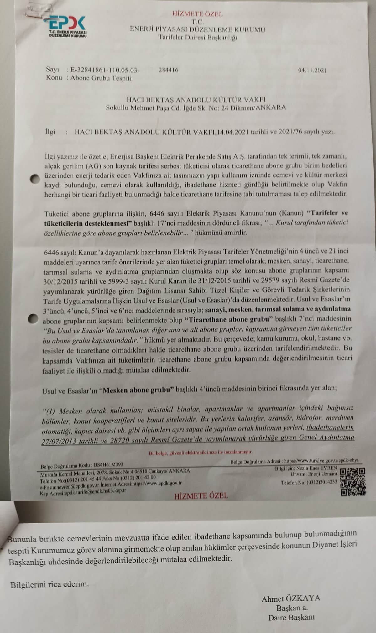 Öte yandan Hacı Bektaş Veli Vakfı’nın EPDK’ya başvurusunun cevabı da paylaşıldı. EPDK’dan Hacı Bektaş Veli Vakfı’na verilen cevapta, “Cemevlerinin mevzuatta ifade edilen ibadethane kapsamında bulunup bulunmadığının tespiti kurumumuz görev alanına girmemekte olup, anılan hükümler çerçevesinde konunun Diyanet İşleri Başkanlığı uhdesinde değerlendirilebileceği mütalaa edilmektedir” ifadeleri yer aldı.