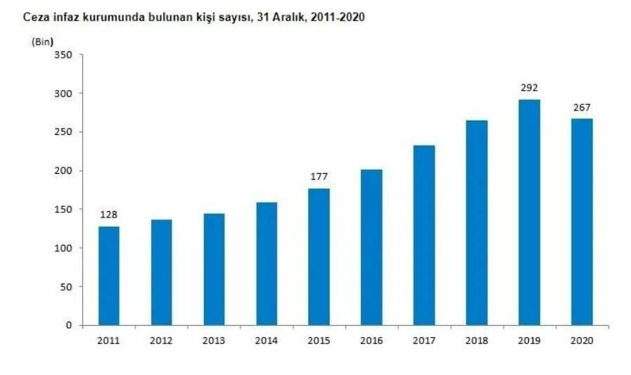 Sözcü’nün haberine göre, Türkiye’deki cezaevlerinin toplam kapasitesi 271 bin 823 kişi ancak Mart 2022 sonu itibariyle cezaevlerinde 314 bin 502 kişi bulunuyor. Adalet Bakanlığı verilerine göre, bu kişilerin 275 bin 965’i hükümlü, 38 bin 537’si tutuklu. Cezaevi nüfusunun 300 bin 253’ü erkeklerden, 12 bin 173’ü kadınlardan, 2 bin 76’sı ise çocuklardan oluşuyor. 2021 yılında cezaevlerinde 272 bin kişi olduğu dikkate alındığında toplam cezaevi nüfusunun Mart 2022 itibariyle 42 bin arttığı görülüyor.