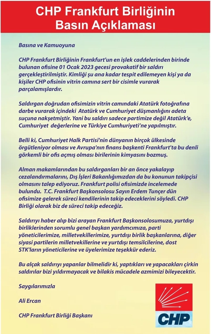 Almanya’nın Frankfurt kentinde faaliyet gösteren Cumhuriyet Halk Partisi (CHP) Frankfurt Birliği’ne ait ofise yılbaşı gecesi bir saldırı düzenlendi.
