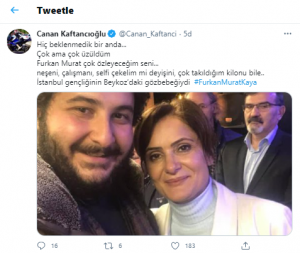 Canan Kaftancıoğlu, “Hiç beklenmedik bir anda… Çok ama çok üzüldüm Furkan Murat çok özleyeceğim seni… neşeni, çalışmanı, selfi çekelim mi deyişini, çok takıldığım kilonu bile.. İstanbul gençliğinin Beykoz’daki gözbebeğiydi #FurkanMuratKaya” ifadelerini kullandı.
