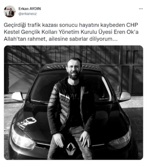 CHP Bursa Milletvekili Erkan Aydın, Eren Ok’un yaşamını yitirmesinin ardından sosyal medya hesabından taziye mesajı yayımlayarak, “Geçirdiği trafik kazası sonucu hayatını kaybeden CHP Kestel Gençlik Kolları Yönetim Kurulu Üyesi Eren Ok’a Allah’tan rahmet, ailesine sabırlar diliyorum” ifadelerini kullandı.