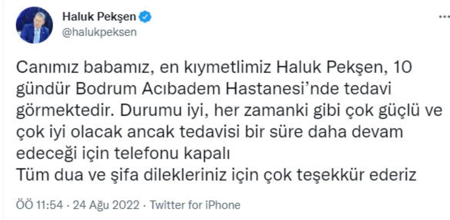 Açıklamada, “Canımız babamız, en kıymetlimiz Haluk Pekşen, 10 gündür Bodrum Acıbadem Hastanesi’nde tedavi görmektedir. Durumu iyi, her zamanki gibi çok güçlü ve çok iyi olacak ancak tedavisi bir süre daha devam edeceği için telefonu kapalı. Tüm dua ve şifa dilekleriniz için çok teşekkür ederiz” denildi.