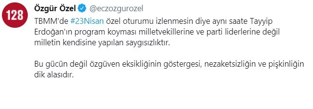 * TBMM’de 23 Nisan özel oturumu izlenmesin diye aynı saate Tayyip Erdoğan’ın program koyması milletvekillerine ve parti liderlerine değil milletin kendisine yapılan saygısızlıktır. Bu gücün değil özgüven eksikliğinin göstergesi, nezaketsizliğin ve pişkinliğin dik alasıdır.