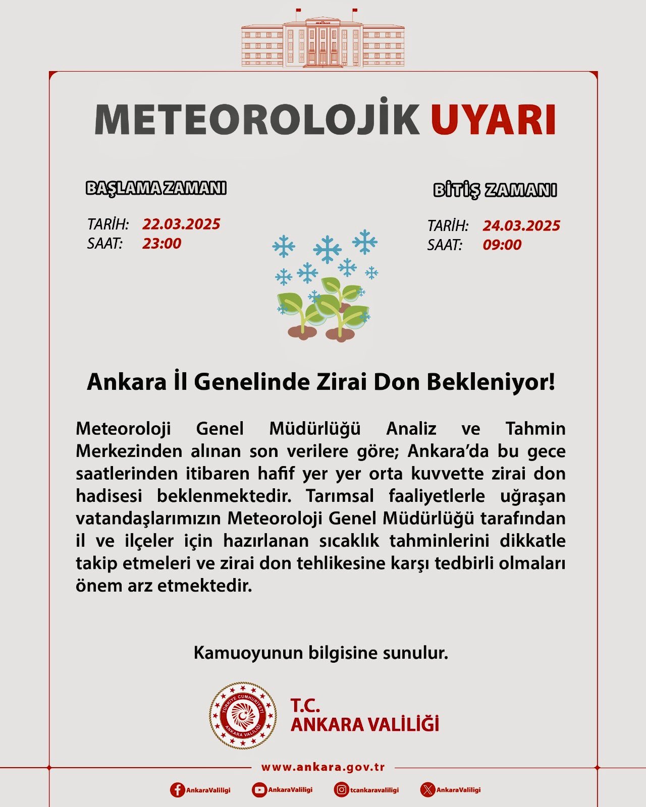 Ankara Valilliği’nin sosyal medya hesabından yapılan açıklamada, “Meteoroloji Genel Müdürlüğü Analiz ve Tahmin Merkezinden alınan son verilere göre; Ankara’da bu gece saatlerinden itibaren hafif yer yer orta kuvvette zirai don hadisesi beklenmektedir. Tarımsal faaliyetlerle uğraşan vatandaşlarımızın Meteoroloji Genel Müdürlüğü tarafından il ve ilçeler için hazırlanan sıcaklık tahminlerini dikkatle takip etmeleri ve zirai don tehlikesine karşı tedbirli olmaları önem arz etmektedir” ifadeleri kullanıldı.