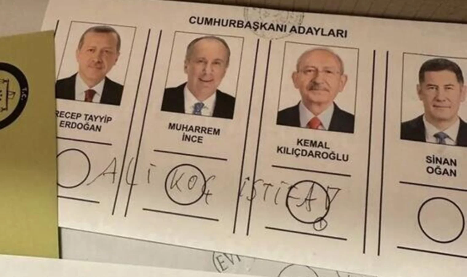 Seçimde yaşanan ilginç olaylardan biri de cumhurbaşkanlığı seçim pusulasına yazılan not oldu. Oy kullanan bir yurttaş, cumhurbaşkanlığı için oy kullanacağı pusulanın üstüne kalemle “Ali Koç istifa” yazdı.