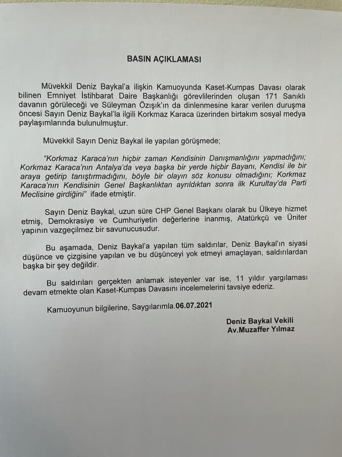 Eski CHP Genel Başkanı Deniz Baykal, Korkmaz Karaca iddialarına ilişkin avukatı aracılığıyla açıklama yaptı.