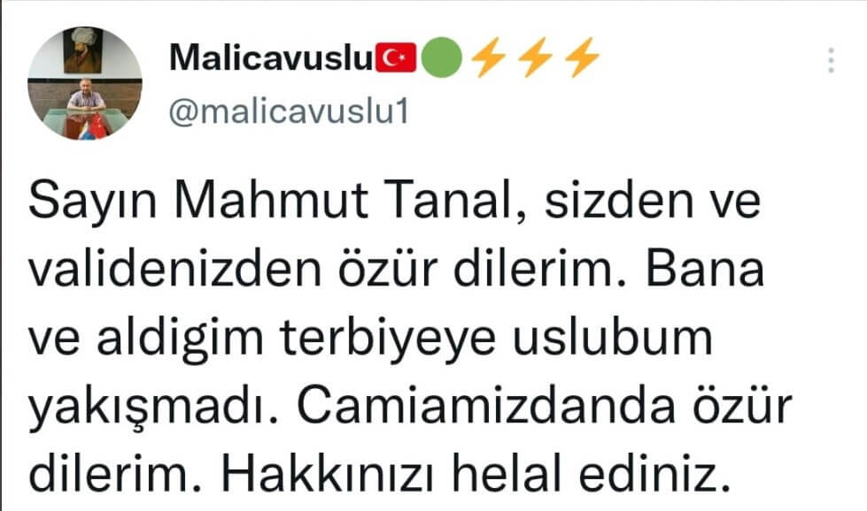 Çavuşlu özür mesajında şu ifadeleri kullandı: “Sayın Mahmut Tanal, sizden ve validenizden özür dilerim. Bana ve aldığım terbiyeye üslubum yakışmadı. Camianızdan da özür dilerim. Hakkınızı helal ediniz.”