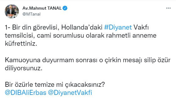 Mahmut Tanal ise şu yanıtı yazdı: “Bir din görevlisi, Hollanda’daki Diyanet Vakfı temsilcisi, cami sorumlusu olarak rahmetli anneme küfrettiniz. Kamuoyuna duyurmam sonrası o çirkin mesajı silip özür diliyorsunuz. Bir özürle temize mi çıkacaksınız?”