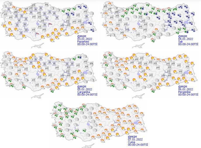 Meteoroloji Genel Müdürlüğü tarafından yapılan son değerlendirmelere göre: Ülkemizin kuzey, iç ve doğu kesimlerinin parçalı ve çok bulutlu, Trabzon ve Rize çevreleri ile Artvin’in kıyı kesimlerinin yağmurlu, Artvin’in iç kesimleri ile Hakkari çevrelerinin karla karışık yağmur ve kar yağışlı geçeceği tahmin ediliyor. Rüzgarın Doğu Akdeniz ile Doğu Anadolu’nun batısında kuzey ve kuzeybatı yönlerden kuvvetli ve kısa süreli fırtına (50-70 km/sa) şeklinde eseceği tahmin ediliyor. Sabah ve gece saatlerinde iç ve doğu kesimlerde buzlanma ve don olayı ile birlikte yer yer pus ve sis bekleniyor.