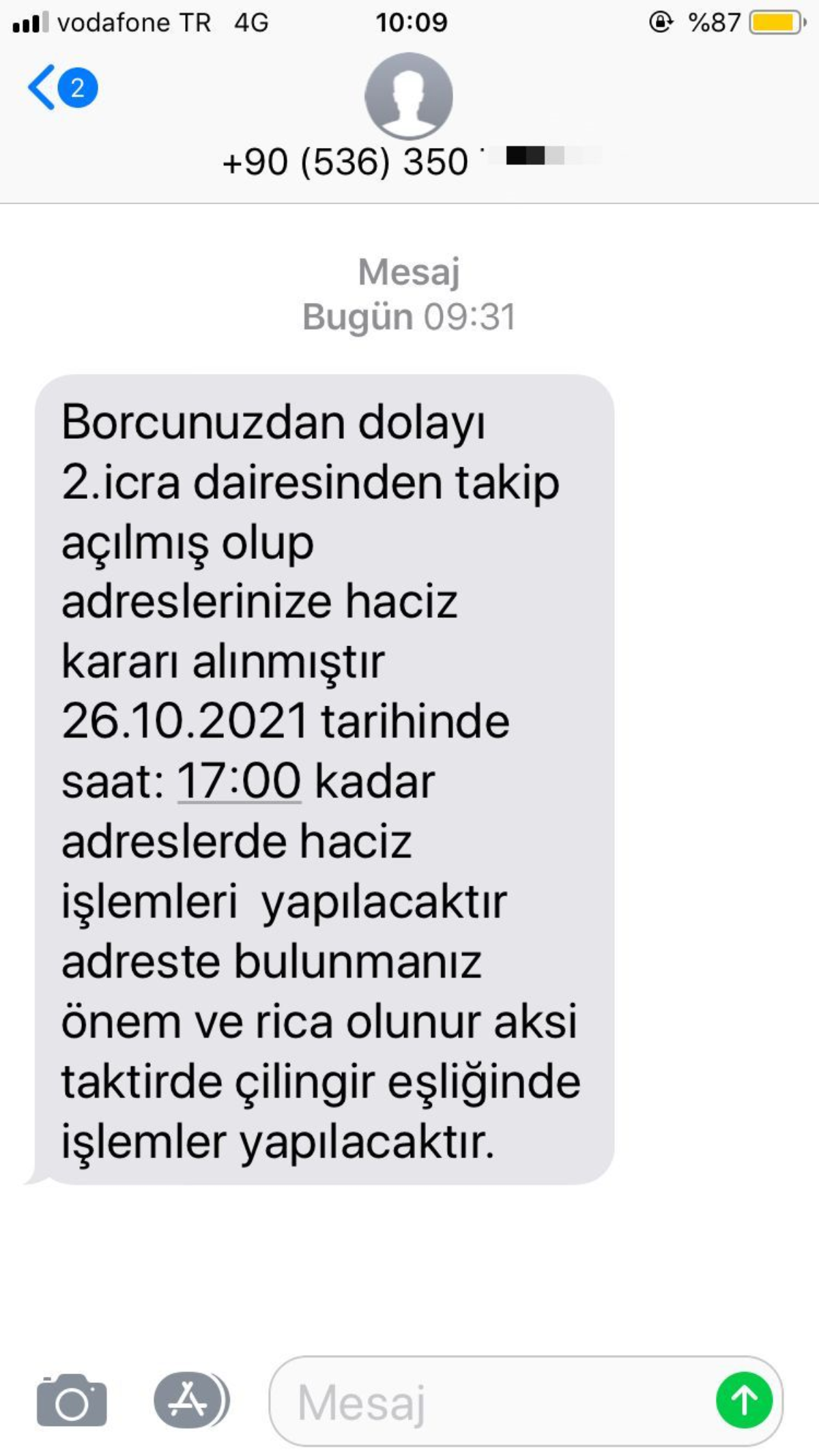 Atılan mesajda, “Borcunuzdan dolayı 2. İcra Dairesi’nden takip açılmış olup adreslerinize haciz kararı alınmıştır. 26.10.2021 tarihinde saat 17:00 kadar adreslerde haciz işlemleri yapılacaktır. Adreste bulunmanız önem ve rica olunur. Aksi taktirde çilingir eşliğinde işlemler yapılacaktır” diye belirtildi.