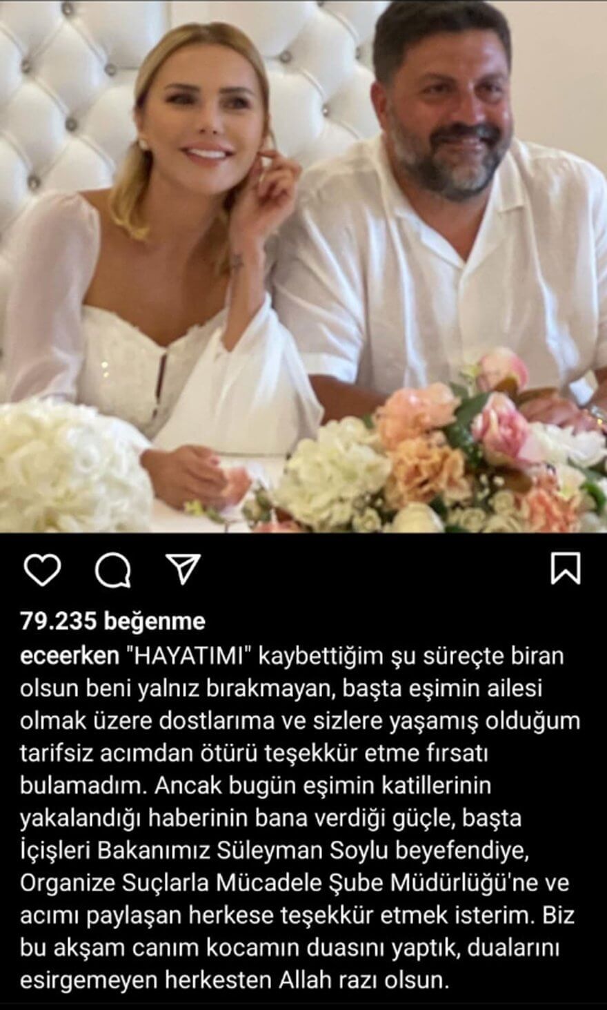 *Ancak bugün eşimin katillerinin yakalandığı haberinin bana verdiği güçle, başta İçişleri Bakanımız Süleyman Soylu beyefendiye, Organize Suçlarla Mücadele Şube Müdürlüğü’ne ve acımı paylaşan herkese teşekkür etmek isterim.