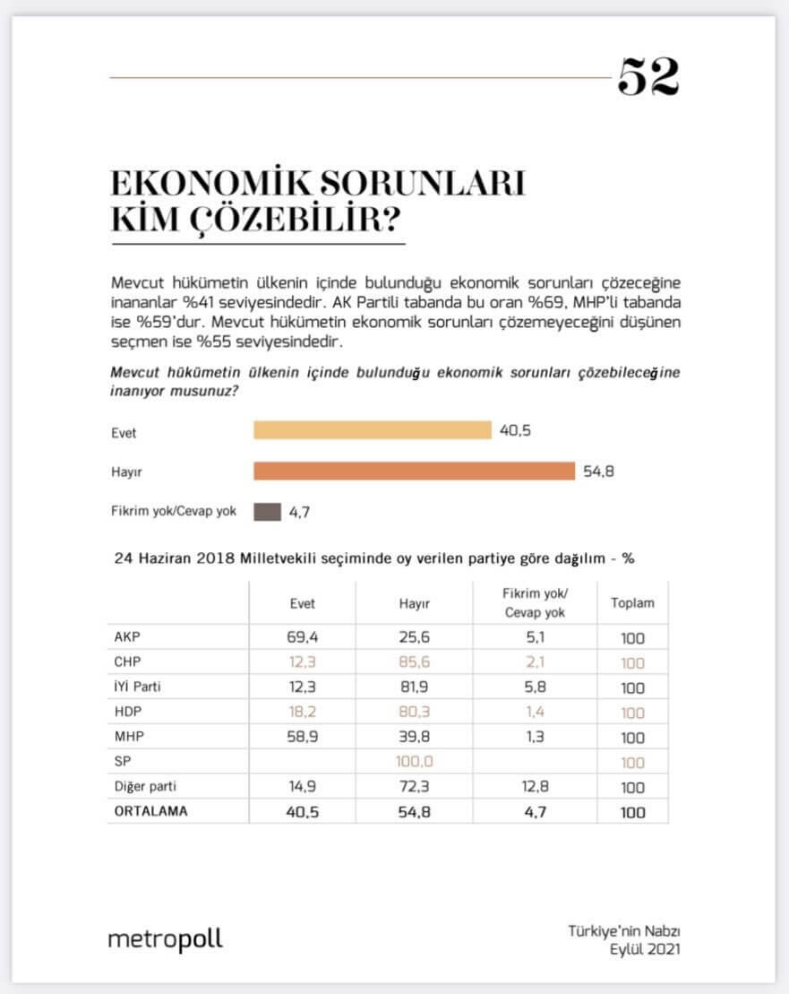 MetroPOLL Araştırma’nın Kurucusu ve Yöneticisi Özer Sencar, Türkiye’nin Nabzı Eylül 2021 araştırmasından ‘Ekonomik sorunları kim çözebilir’ anketinin sonuçlarını paylaştı.