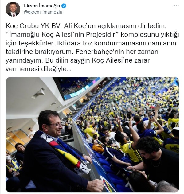 İmamoğlu, “Koç Grubu YK BV. Ali Koç’un açıklamasını dinledim. “İmamoğlu Koç Ailesi’nin Projesidir” komplosunu yıktığı için teşekkürler. İktidara toz kondurmamasını camianın takdirine bırakıyorum. Fenerbahçe’nin her zaman yanındayım. Bu dilin saygın Koç Ailesi’ne zarar vermemesi dileğiyle…” ifadelerini kullandı.