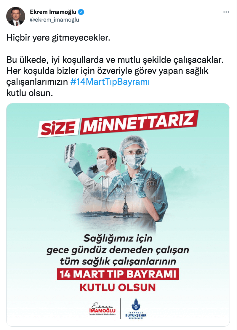 İstanbul Büyükşehir Belediye (İBB) Başkanı Ekrem İmamoğlu, 14 Mart Tıp Bayramı’yla ilgili olarak kişisel Twitter hesabında bir paylaşımda bulundu.