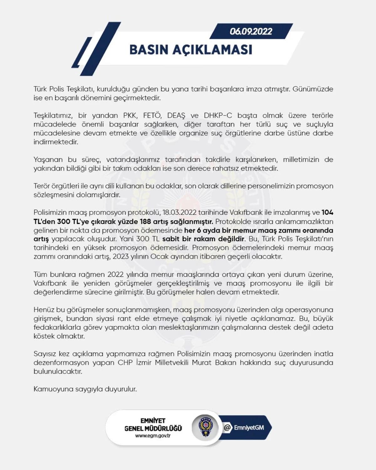 Emniyet Genel Müdürlüğü tarafından yapılan açıklamada, “Polisimizin maaş promosyonu üzerinden inatla dezenformasyon yapan CHP İzmir Milletvekili Murat Bakan hakkında suç duyurusunda bulunulacaktır.” denildi.