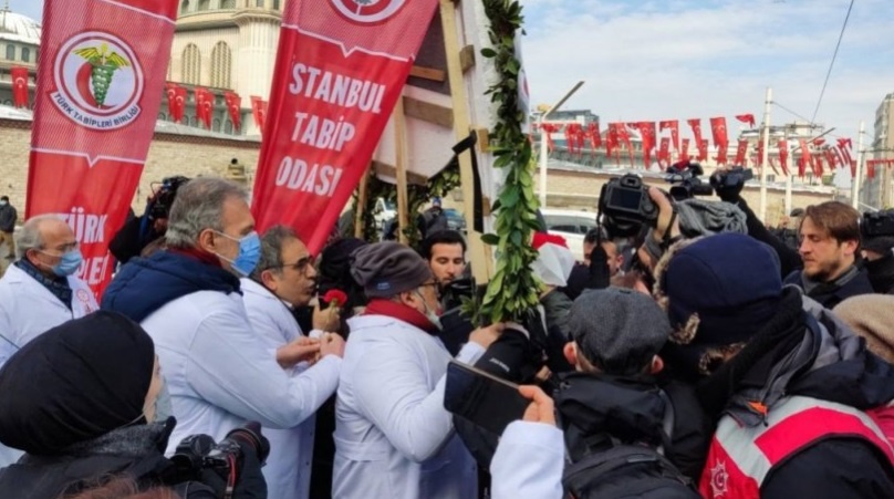 Türk Tabipler Birliği (TTB) başta olmak üzere sağlık emek ve meslek örgütleri özlük haklarına ilişkin çeşitli taleplerle iş bırakmış, dün 14 Mart Tıp Bayramı vesilesiyle Taksim Atatürk Anıtı’na çelenk bırakmak isteyen İstanbul Tabip Odası üyeleri ise polis müdahalesi ile karşılaşmıştı.