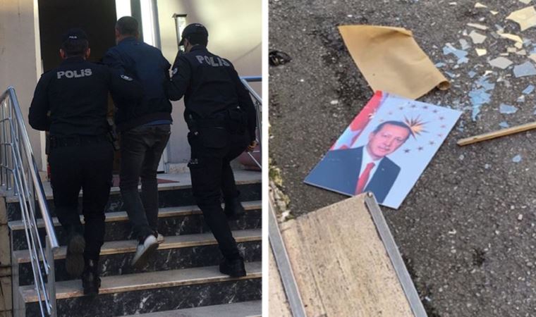 Kaymakamlık binasına giden A.Ç, binanın giriş kısmında bulunan Cumhurbaşkanı Erdoğan’ın fotoğrafını alıp yere attı. A.Ç., polis ekiplerince gözaltına alındı.