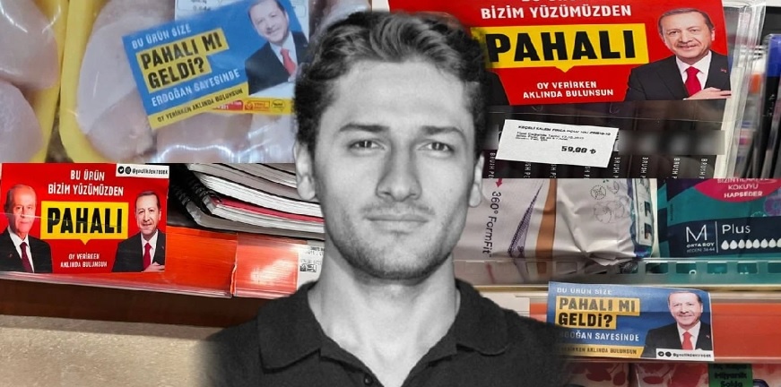 Seçimlere günler kala market raflarına yapıştırılmaya başlanan “Bu ürün size pahalı mı geldi? Erdoğan sayesinde” çıkartmaları sosyal medyada gündem olurken, çıkartmaları hazırlayan görsel iletişim tasarımcısı Mahir Akkoyun, gözaltına alındı.