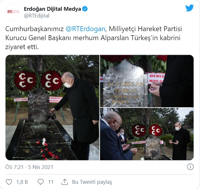 Yapılan açıklamada, “Cumhurbaşkanımız, Milliyetçi Hareket Partisi Kurucu Genel Başkanı merhum Alparslan Türkeş’in kabrini ziyaret etti” denilerek ziyarete dair fotoğraflar paylaşıldı.