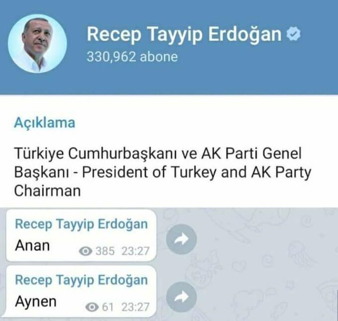 AKP Genel Başkanı ve Cumhurbaşkanı Erdoğan’ın onaylı telegram kanalında “anan” ve “aynen” kelimeleri mesaj olarak paylaşıldı.