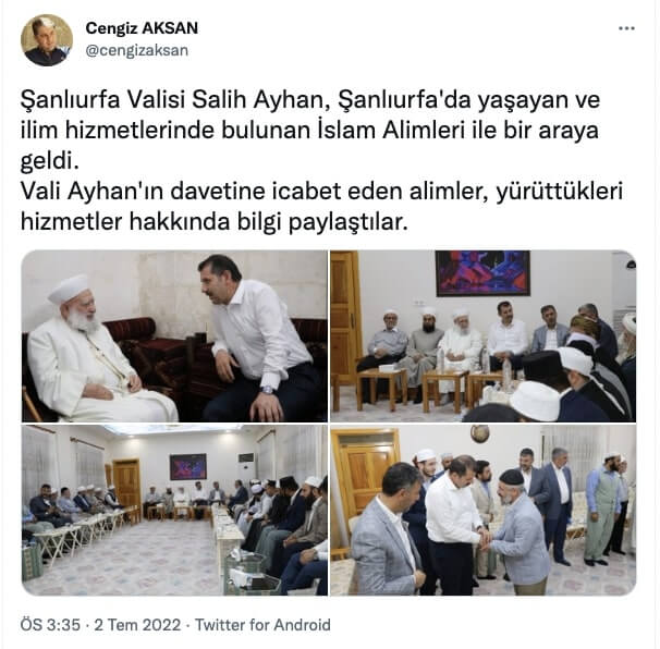 Şanlıurfa Valiliği’ne 11 Mayıs 2022’de yayımlanan Cumhurbaşkanlığı Kararnamesi ile atanan Salih Ayhan 20 Mayıs 2022’de görevine başladı. Vali Ayhan, göreve geldikten yaklaşık 40 gün sonra şeyhlerle bir araya geldi.