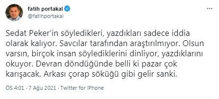 Gazeteci Fatih Portakal, suç örgütü lideri Sedat Peker’in dün Twitter hesabından ortaya attığı iddialar hakkında çarpıcı bir yorumda bulundu.