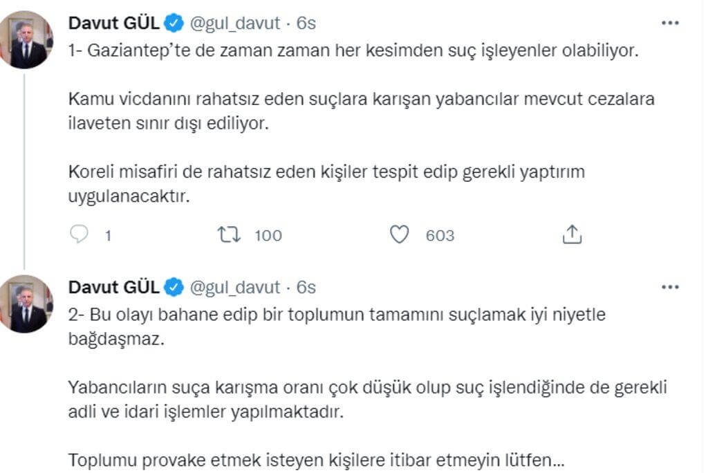 “Gaziantep’te de zaman zaman her kesimden suç işleyenler olabiliyor. Kamu vicdanını rahatsız eden suçlara karışan yabancılar mevcut cezalara ilaveten sınır dışı ediliyor. Koreli misafiri de rahatsız eden kişiler tespit edip gerekli yaptırım uygulanacaktır. Bu olayı bahane edip bir toplumun tamamını suçlamak iyi niyetle bağdaşmaz. Yabancıların suça karışma oranı çok düşük olup suç işlendiğinde de gerekli adli ve idari işlemler yapılmaktadır. Toplumu provoke etmek isteyen kişilere itibar etmeyin lütfen.”