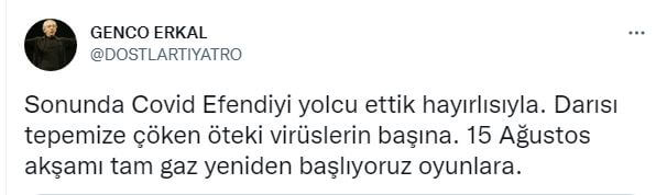 Genco Erkal sevindiren haberi şu şekilde duyurdu; “Sonunda Covid efendiyi yolcu ettik hayırlısıyla. Darısı tepemize çöken öteki virüslerin başına. 15 Ağustos akşamı tam gaz yeniden başlıyoruz oyunlara.”