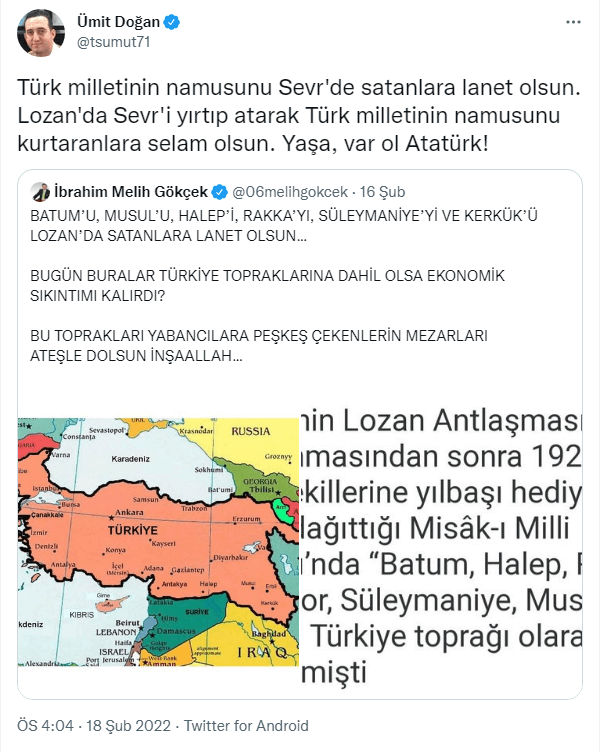 Gökçek “Batum’u, Musul’u, Rakka’yı, Süleymaniye’yi ve Kerkük’ü Lozan’da satanlara lanet olsun. Bugün buralar Türkiye topraklarına dahil olsa ekonomik sıkıntı mı kalırdı? Bu toprakları yabancılara peşkeş çekenlerin mezarları ateşle dolsun inşallah” paylaşımıyla ekonomik krizin sorumlusunun Atatürk ve Lozan Anlaşması olduğunu iddia etti.