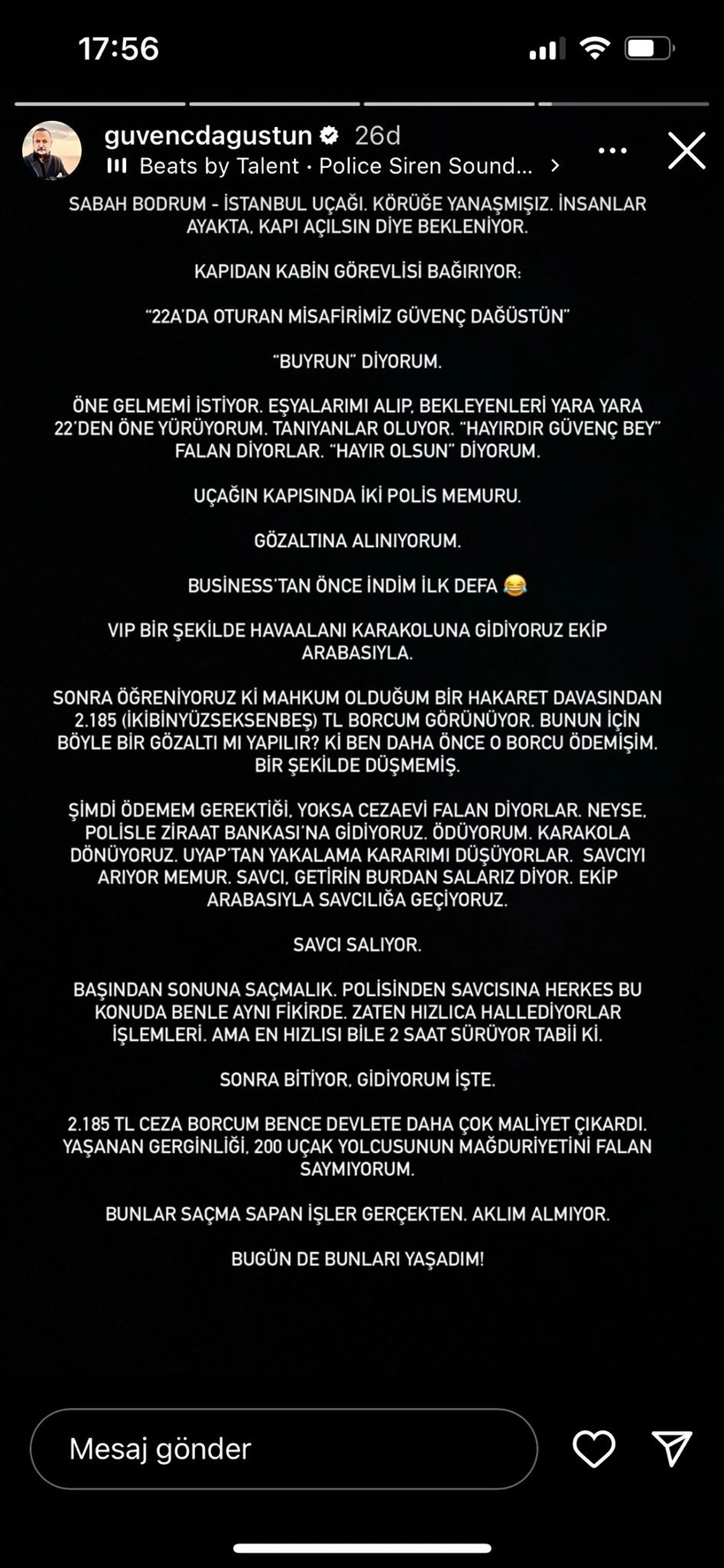 Dağüstün, karakolda daha önce mahkum olduğu bir cezadan 2 bin 185 liralık borcu olduğu gerekçesiyle gözaltı gerekçesini öğrendiğini aktardı. Cezayı ödediği halde sistemden düşmediğini belirten Dağüstün, 2 saat sonra savcılıktan salındığını belirterek “Savcı, getirin buradan salarız diyor. Savcılığa geçiyoruz. Başından sonuna saçmalık. Polisi savcısı benimle aynı fikirde. 2 bin 185 lira ceza borcum devlete daha çok maliyet çıkardı. Yaşanan gerginliği, 200 uçak yolcusunun mağduriyetini saymıyorum” dedi.