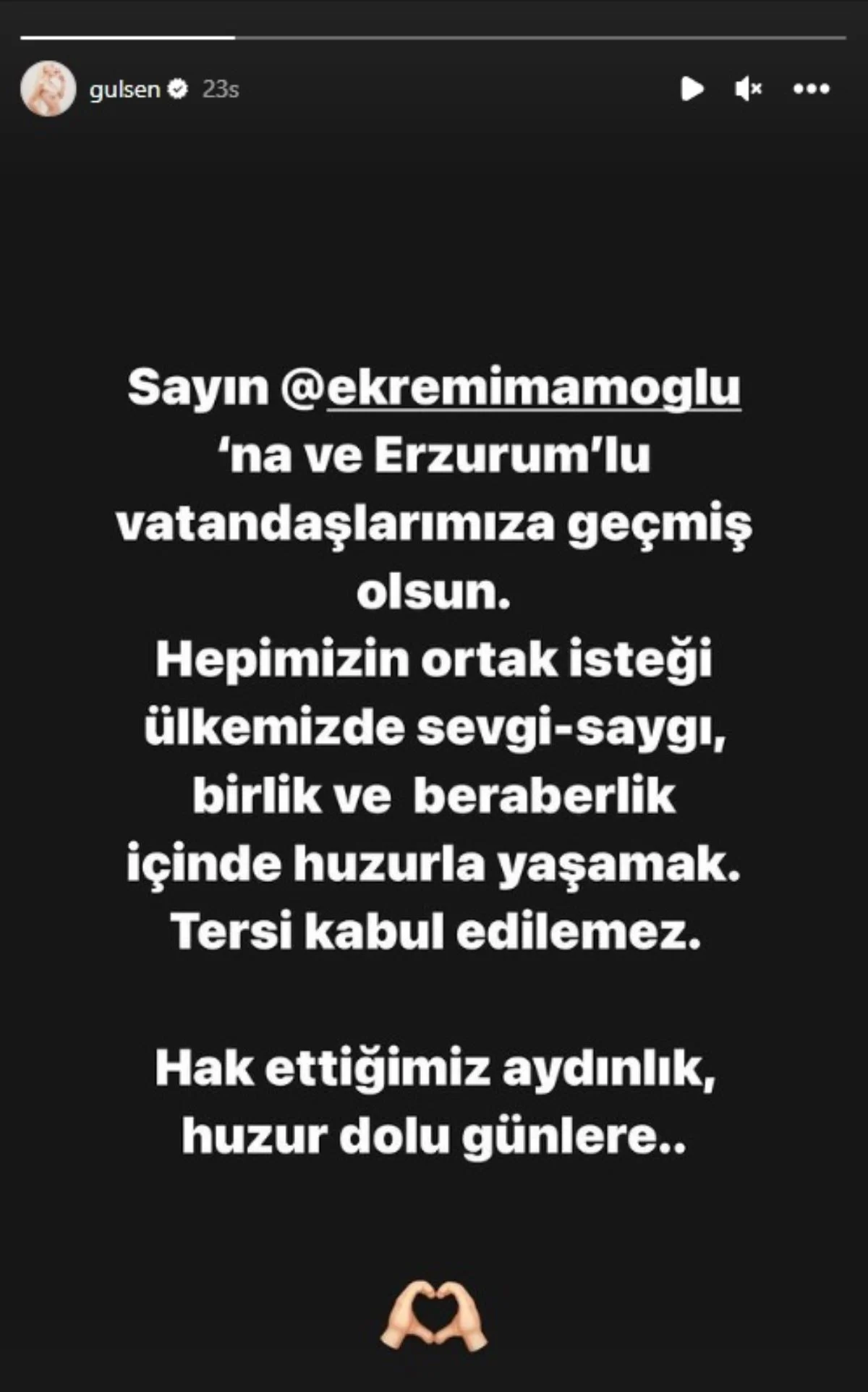 “Sayın Ekrem İmamoğlu’na ve Erzurumlu vatandaşlarımıza geçmiş olsun. Hepimizin ortak isteği ülkemizde sevgi-saygı, birlik ve beraberlik içinde huzurla yaşamak. Tersi kabul edilemez. Hak ettiğimiz aydınlık, huzur dolu günlere…”