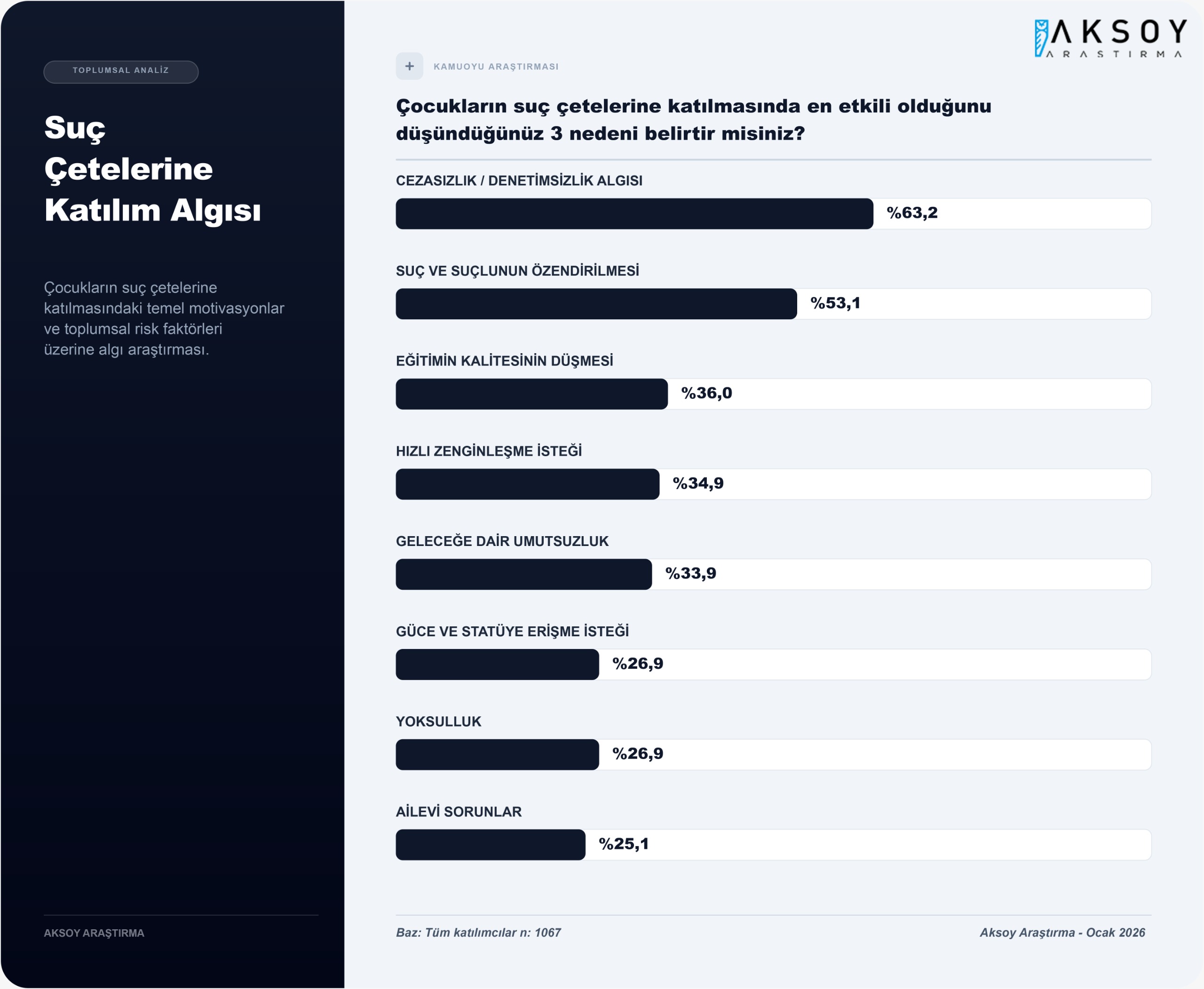 Aksoy Araştırma’nın saha araştırmasında “Çocukların suç çetelerine katılmasında en etkili olduğunu düşündüğünüz 3 nedeni belirtir misiniz?” sorusu da soruldu.