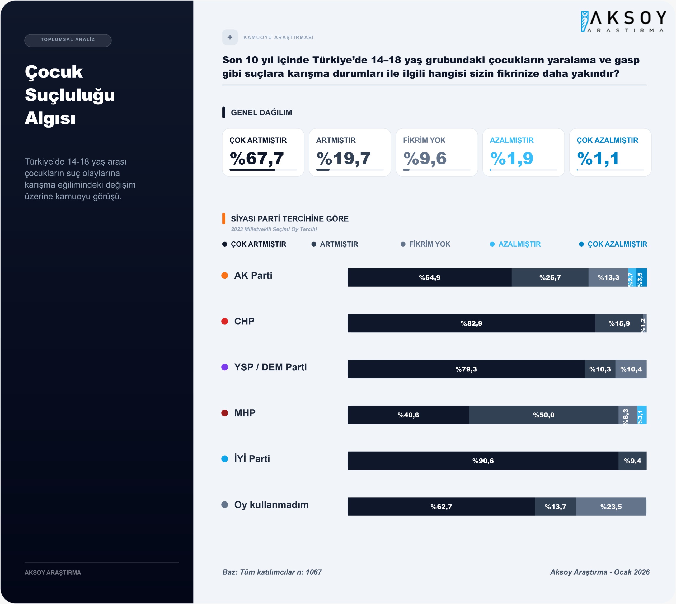 Aksoy Araştırma’nın suça karışan çocuklarla ilgili yaptığı araştırmadan da çarpıcı sonuçlar çıktı. Aksoy Araştırmaya göre Türkiye’de toplumun yüzde 87’si Çocukların suça karışma oranının arttığını düşünüyor